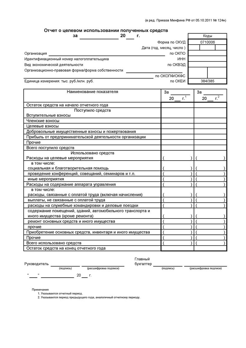 0710006. Отчет о целевом использовании средств. Это годовая бухгалтерская отчетность, которую составляют все некоммерческие организации. Здесь отображаются остатки целевых средств в начале и в конце периода, и источники их появления.