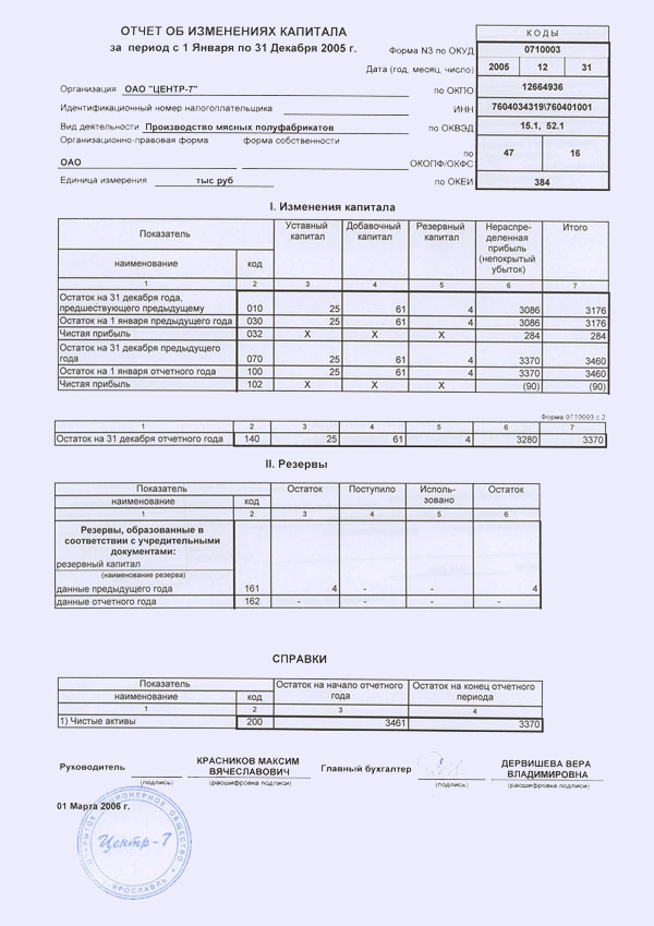 0710003. Отчет об изменениях капитала. Здесь содержаться данные об уставном капитале, резервном, добавочном, а еще сведения о том, как изменяется величина нераспределенной прибыли экономического субъекта. Данный отчет в свою очередь состоит из трех разделов.