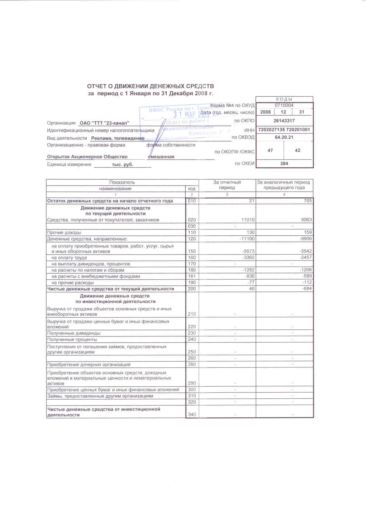 0710004. Отчет о движении денежных средств. Информация о денежных поступлениях в фирму и ее расходах. Благодаря этому отчету можно дать оценку финансовой гибкости предприятия.
